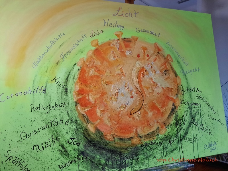 2020 vor 6 Jahren in dieser Zeit habe ich sehr besorgt die Ausbreitung und Folgen von Covid 19 wahr genommen. Vor 6 Jahren am 13.März 2020 am Vormittag habe ich meine Gruppen in der Malschule informiert, dass der Malunterricht in meiner privaten Malschule bis auf weiteres ausfällt. Vor 6 Jahren schloss ich meine ausgebuchte Malschule mit Malgruppen im Kinder- und Jugendbereich, sowie Erwachsenengruppen am Abend. Zum Schutz vor Ansteckung und mit dem Bewußtsein, dass sich keiner untereinander bei mir anstecken sollte. Ausserdem gab es den ersten Lockdown in 2020. Was ich nicht wußte, dass ich nicht wieder aufmachen würde und auch das hatte Gründe, die ich meinen ganzen Schüler/innen in einem Infobrief geschrieben habe. Seit dem sind Jahre vergangen…. Dies ist das gemalte Virus von mir. Ein kleines Virus in Großformat gemalt, das Original ist 140×100 cm groß.