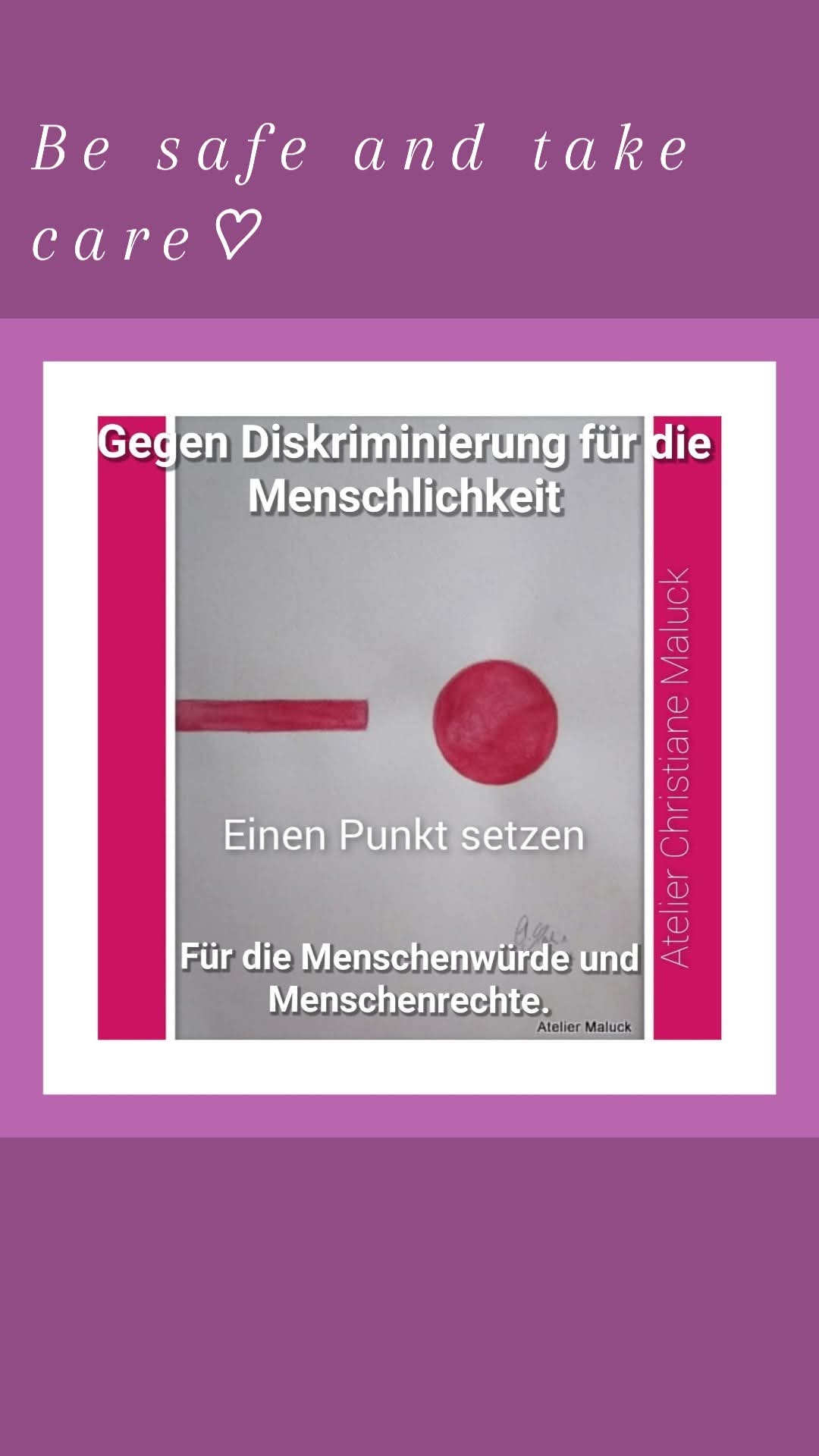 Für die Menschlichkeit und Menschenwürde sein, erfordert Zivilcourage, ein respektvolles Miteinander und das Verständnis für die Situation seines Gegenüber. Hintergründe zu verstehen, sich auf einen Austausch auf Augenhöhe zu begegnen, setzt Reife, Erfahrung und Erkenntnis voraus. Sich zu diskreditieren und diskriminieren ist die niedrigste Ebene und Stufe wie sich Menschen begegnen und hat nichts mit Menschlichkeit zu tun. In unserer Demokratie ist die Würde des Menschens unantastbar laut unseren Grundrechten💖 Versteht eine Gesellschaft, die das mit Füssen tritt und allein diese Kostbarkeit schon nicht mehr zu schätzen weiß, was es bedeutet sozial, empathisch und frei zu leben? Herzliche Grüße von einer nachdenklichen Künstlerin, die sich wundert über unsere momentane Zeit, in der Diskriminierung, Beleidigungen und Diffamierungen Alltag geworden sind in der Gesellschaft. Ob diese Haltung uns Glück bringen wird für unsere Zukunft?